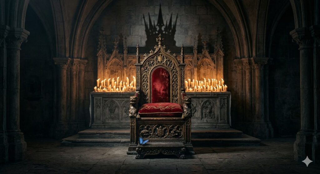 これは「準備された玉座」を意味し、目に見えない神や再臨する審判者のために空けておく玉座を指します。ワンピースの作中では、誰も座らないはずの玉座に「イム様」が座っているという描写がありますが、これは「独裁を許さない民主的な誓い」を偽装しながら、実際には絶対的な支配者が隠れているという皮影的な構造を象徴しています。